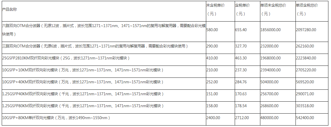 具體采購(gòu)產(chǎn)品包括:六路雙向OTM合分波器 3200端、三路雙向OTM合分波器800端、25G SFP28 10KM雙纖雙向彩光模塊4800個(gè) 、10G SFP+10KM雙纖雙向彩光模塊11400個(gè)、10G SFP+40KM雙纖雙向彩光模塊 2000個(gè)、1.25G SFP 40KM雙纖雙向彩光模塊1700個(gè)、1.25G SFP 80KM雙纖雙向彩光模塊1700個(gè)、10G SFP+80KM單纖雙向光模塊 200個(gè)。