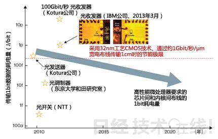 比如,2013年3月IBM利用硅光子技術(shù)開發(fā)出了耗電量為1pJ/bit的光收發(fā)器IC。預(yù)計(jì)電傳輸?shù)淖畹秃碾娏吭趥鬏斁嚯x為1cm時(shí)約為150fJ(0.15pJ)/bit(圖3)1)。雖然還有好幾倍的差距,但如果只限于光傳輸?shù)母黜?xiàng)功能,耗電量比IBM的試制品小2、3位數(shù)的技術(shù)也已開發(fā)出來。