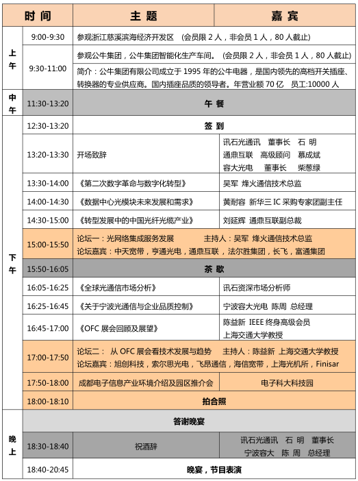 在本次會(huì)議上,您有機(jī)會(huì)參觀開關(guān)行業(yè)領(lǐng)導(dǎo)者——公牛集團(tuán),感受大企業(yè)的經(jīng)營(yíng)理念與自動(dòng)化生產(chǎn)線,從中找尋屬于您的管理之道;您還可以盡情討論100G,400G高速通訊發(fā)展情況,了解行業(yè)發(fā)展脈絡(luò),胸有丘壑化乾坤;當(dāng)然,還有光網(wǎng)絡(luò)集成服務(wù)發(fā)展,全球光通信市場(chǎng)分析等眾多干貨等著您。