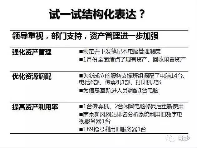 在內(nèi)部匯報(bào)建議按基層,中層,高層分類考慮,基層往往側(cè)重搜集材料,中層往往側(cè)重提煉思路,高層往往側(cè)重提出愿景,這些就決定了你寫(xiě)匯報(bào)的基調(diào)和選材必須有差異。