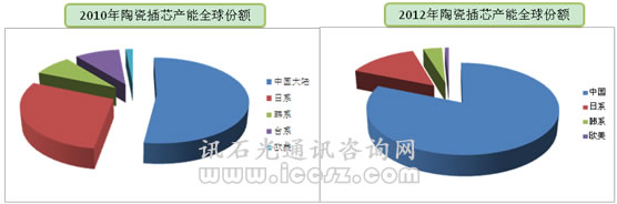 由下圖可以看出,中國自2010年開始陶瓷插芯已經(jīng)成為全球主要的陶瓷插芯供應(yīng)商,單大陸就占52.5%,加上臺(tái)灣,產(chǎn)自中國的陶瓷插芯已占62%左右。2012年,全球陶瓷插芯產(chǎn)能大約7800萬,中國占81%多。
