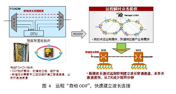 通過帶寬資源池+遠(yuǎn)程“自動(dòng)ODF”,通過空閑的支路端口和提前備好的線路波道構(gòu)筑的帶寬資源池,在網(wǎng)管上遠(yuǎn)程端到端配置業(yè)務(wù),具備波長無關(guān)、方向無關(guān)功能的ROADM可以自動(dòng)建立波長連接,免去逐站ODF跳纖,業(yè)務(wù)開通和調(diào)整效率大幅提升,時(shí)間可縮短至30分鐘,未來配合T-SDN等軟件可以進(jìn)一步減少到分鐘級。