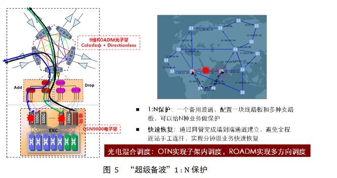 “超級備波”1:N保護(hù),只要增加一塊線路單板(直接利用備波線路板,不需要額外配置),通過光電混合交叉調(diào)度:OTN實(shí)現(xiàn)電子架內(nèi)調(diào)度,ROADM實(shí)現(xiàn)光子架多線路方向調(diào)度,即可保護(hù)子架內(nèi)所有線路方向的所有業(yè)務(wù)。