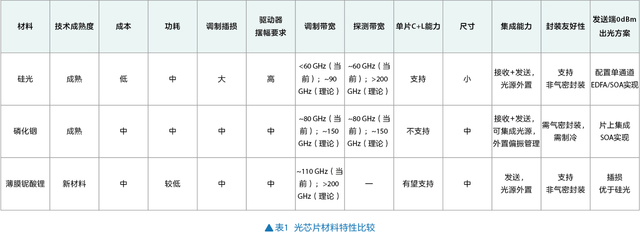 相干收發(fā)器件是指包括光芯片、電芯片、承載基板/管殼和其他輔助元件的光電集成器件,實(shí)現(xiàn)相干調(diào)制和解調(diào)功能。相干收發(fā)器件的核心是光芯片,光芯片材料有硅光、磷化銦和薄膜鈮酸鋰等3種,其特性如表1所示。其中,硅光是當(dāng)前小型化可插拔模塊的主流選擇;薄膜鈮酸鋰屬于新材料和新技術(shù),當(dāng)前尚未產(chǎn)品化,有望在128GBd時(shí)代廣泛應(yīng)用。