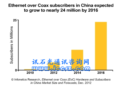【訊石光通訊咨詢(xún)網(wǎng)】Infonetics分析師Jeff Heynen表示:“中國(guó)的電視用戶(hù)達(dá)到2億并且還在快速增長(zhǎng),這為中國(guó)的有線電視運(yùn)營(yíng)商成為挑戰(zhàn)中國(guó)電信和中國(guó)聯(lián)通的固網(wǎng)寬帶服務(wù)提供商提供了巨大的機(jī)會(huì)。鑒于中國(guó)獨(dú)特的多住戶(hù)單元為主的環(huán)境,其有線電視運(yùn)營(yíng)商正采用以太網(wǎng)同軸電纜(Ethernet over Coax,后簡(jiǎn)稱(chēng)EoC)技術(shù)來(lái)迅速推出寬帶服務(wù)與光纖部署競(jìng)爭(zhēng)。”