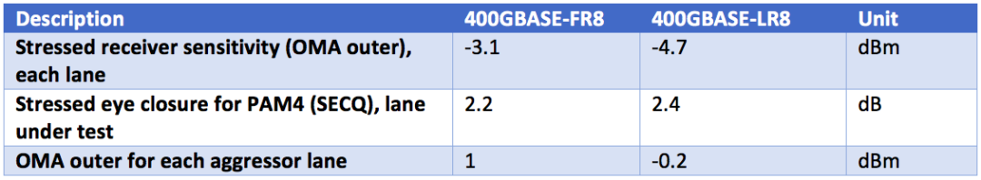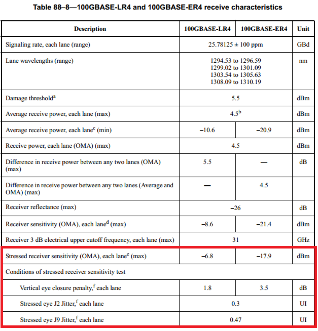 下表中標(biāo)出了100GBASE-LR4和100GBASE-ER4中,對于接收機(jī)壓力測試的要求。