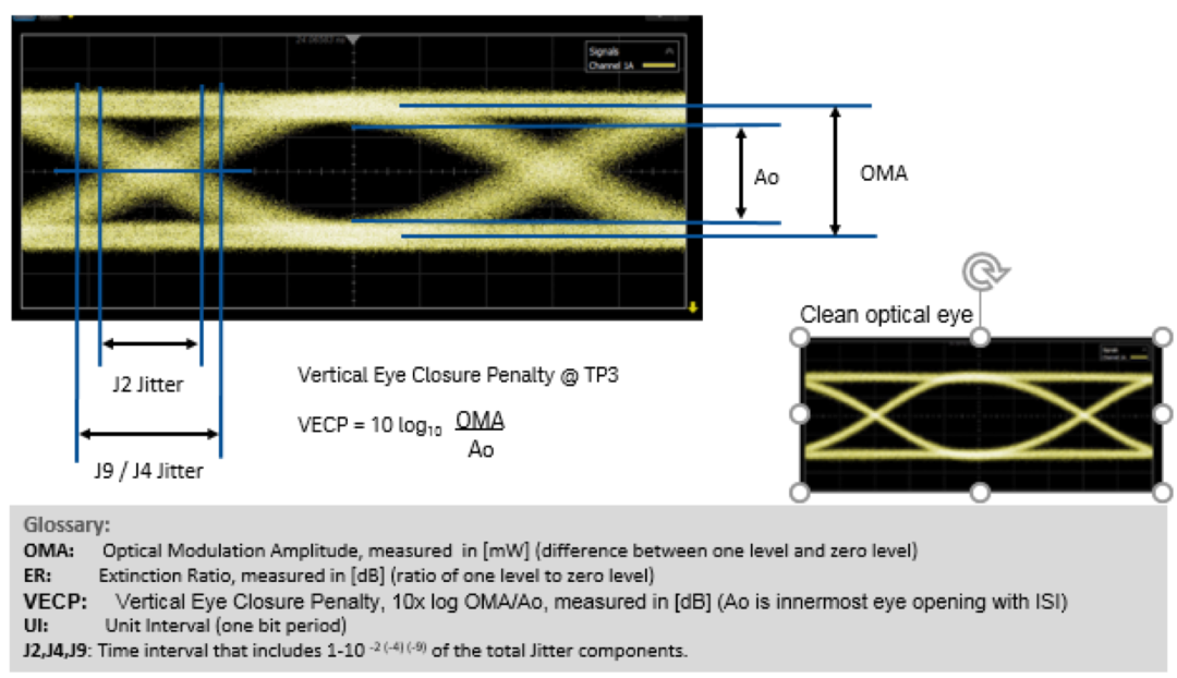 在100GBASE-LR4/ER4中,對于壓力眼的參數(shù)具體定義包含J2,J9, VECP三個(gè)參數(shù),參數(shù)的含義見下圖3: