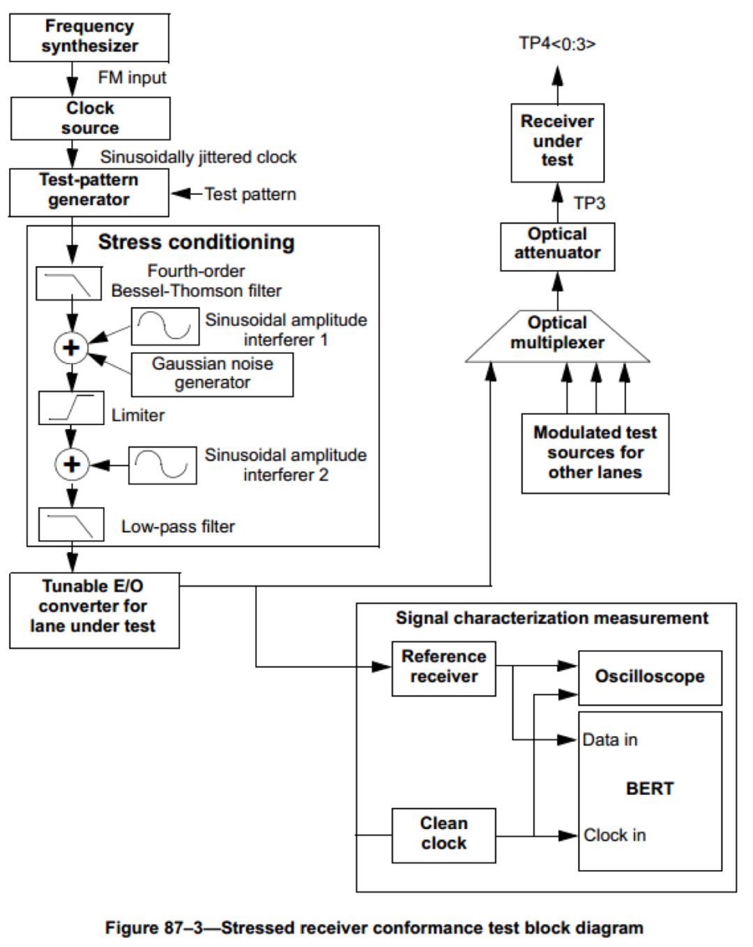 規(guī)范定義的測試點(diǎn)在TP3,即接收機(jī)的輸入端口。在這個(gè)測試點(diǎn)輸入壓力眼信號后,要求接收機(jī)在靈敏度功率下達(dá)到10^-12以下的誤碼率。