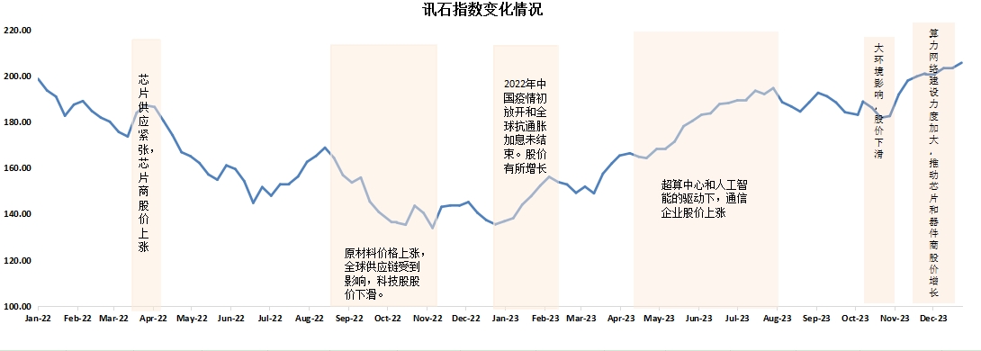 ICC訊 (編輯:Vicki)截止到12月29日,訊石統(tǒng)計的指數(shù)值為205.65,比上月的200.89增長了4.76,12月市場整體增長。11月指數(shù)增長主要是芯片企業(yè)和器件企業(yè)股價增長所致,12月美國道瓊斯指數(shù)和標普500指數(shù)比11月增長4%以上。北美下游云廠商陸續(xù)披露2024年資本開支及訂單需求,AI 建設(shè)力度繼續(xù)加強,隨算力規(guī)模提升及交換速率提升對光模塊需求形成再次催化。ICC記錄到12月器件商股指增長了14.28%。此外,英偉達公布未來兩年算力芯片發(fā)布計劃,加速 1.6T 光模塊迭代及硅光等技術(shù)變革,芯片商股指12月增長了9.49%。整體來看,訊石股指12月呈現(xiàn)增長趨勢,增速放緩。