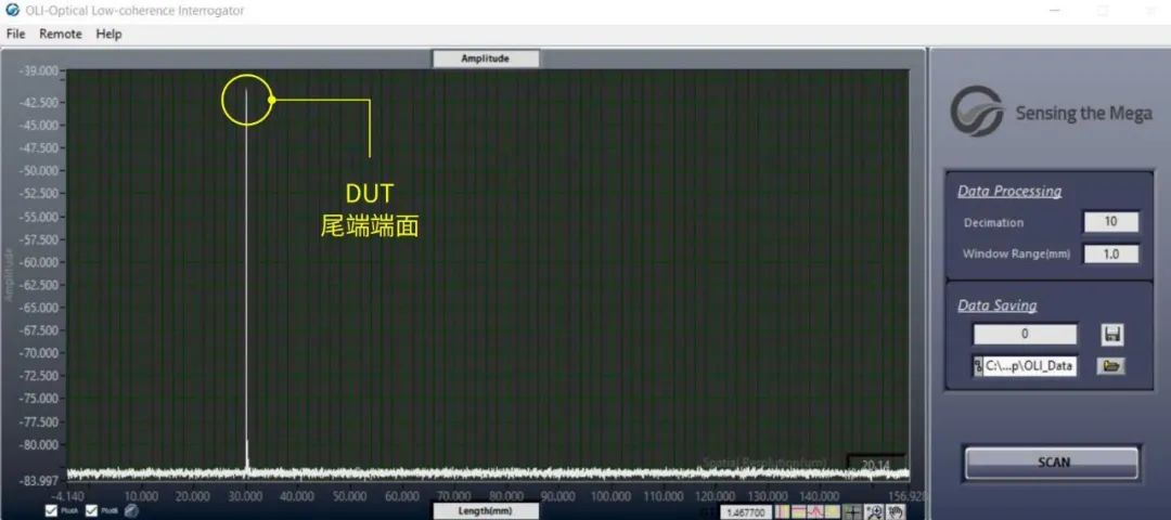 通過對最終的拍頻信號處理,DUT鏈路上的每點(diǎn)反射回來信號的強(qiáng)度可以映射為該點(diǎn)的反射率(即曲線縱坐標(biāo)),DUT的實(shí)際干涉位置對應(yīng)反射鏡Z移動的相應(yīng)距離(即曲線橫坐標(biāo)),從而形成了OLI距離-反射率曲線。