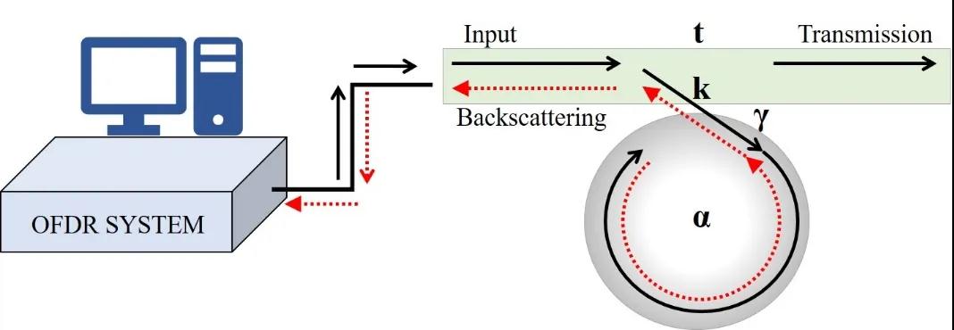 微環(huán)的尺寸較小,但是由于損耗較低,光會在微環(huán)的內(nèi)部環(huán)繞傳播很長的時間,通過探測傳播過程中每個位置處的回波信號,我們可以提取環(huán)內(nèi)的損耗性質。測試原理如圖1所示。我們表征的微環(huán)是一個Ge摻雜型的二氧化硅微環(huán),半徑為1600μm,芯區(qū)的折射率為1.48,包層折射率為1.44左右,微環(huán)的界面尺寸為4μm*4μm。