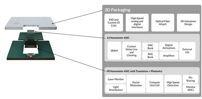 Lightmatter的芯片由兩個垂直堆疊的芯片組成,整個芯片面積為150平方毫米,兩個裸片均由格芯標(biāo)準(zhǔn)CMOS工藝制造,包含超過十億個FinFET晶體管、數(shù)萬個光子算術(shù)單元和數(shù)百個記錄設(shè)置數(shù)據(jù)轉(zhuǎn)換器。