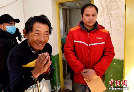 資料圖:西藏的珠拉對(duì)新網(wǎng)購(gòu)的洗衣機(jī)非常滿意,雙手合十感謝配送人員。李林 攝