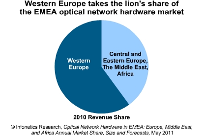 EMEA光網(wǎng)絡(luò)硬件市場(chǎng)出現(xiàn)強(qiáng)勁反彈,不過(guò)從全年來(lái)看,這仍未能扭轉(zhuǎn)2010年度11%的降幅。2011年,在西歐市場(chǎng)支出復(fù)蘇、中東市場(chǎng)接入網(wǎng)絡(luò)的部署(尤其是阿拉伯半島和以色列)以及中東歐市場(chǎng)城域WDM設(shè)備的強(qiáng)勢(shì)增長(zhǎng)(運(yùn)營(yíng)商將微波無(wú)線回程轉(zhuǎn)為光纖接入無(wú)線回程)等情況驅(qū)動(dòng)下,我們預(yù)計(jì)