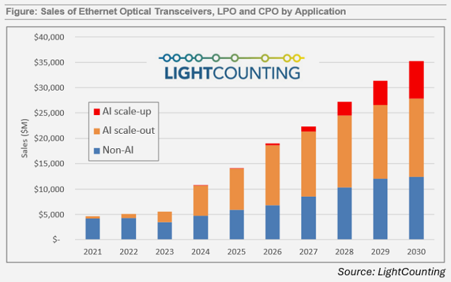 報(bào)告中的圖表展示了以太網(wǎng)光模塊(含重定時(shí)模塊、線性驅(qū)動(dòng)可插拔LPO及共封裝光學(xué)CPO)的最新銷售預(yù)測(cè)。數(shù)據(jù)顯示,2023-2025年AI相關(guān)光學(xué)器件銷售呈現(xiàn)強(qiáng)勁增長(zhǎng)。2026-2030年,AI擴(kuò)展網(wǎng)絡(luò)中光連接的應(yīng)用將進(jìn)一步推動(dòng)市場(chǎng)發(fā)展。CPO因更高的帶寬密度和可靠性,預(yù)計(jì)將成為擴(kuò)展網(wǎng)絡(luò)(Scale-up)連接的最佳選擇。