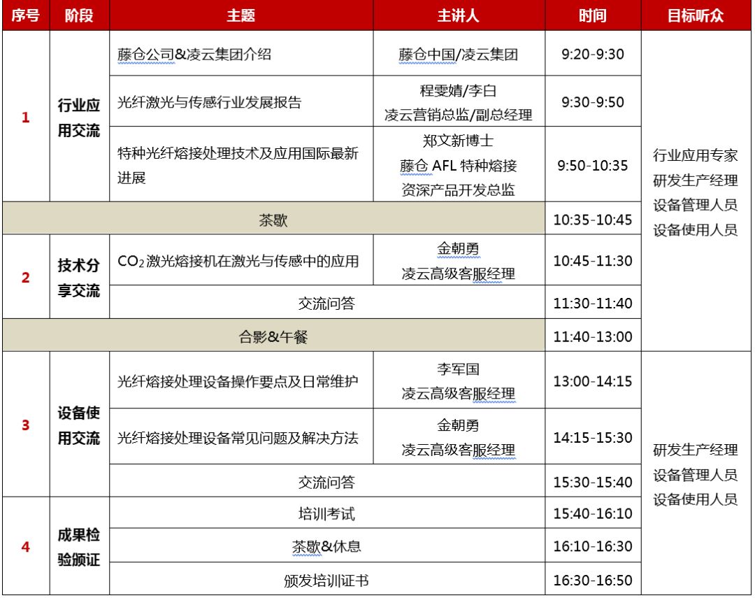 大家期待,本屆交流會再次邀請,藤倉公司特種熔接資深產(chǎn)品開發(fā)總監(jiān)鄭文新博士親臨現(xiàn)場,為大家?guī)砣蛱胤N光纖熔接處理最新進展,并作現(xiàn)場交流培訓。本次交流會將涵蓋光纖激光和傳感行業(yè)應用交流、特種光纖熔接技術及應用分享、熔接設備使用經(jīng)驗交流、培訓成果檢驗測試等四部分,行業(yè)應用技術的勁風強勢襲來,我們期盼您的參與,互動交流,共同提升,成就你我,共創(chuàng)光纖技術行業(yè)美好未來!