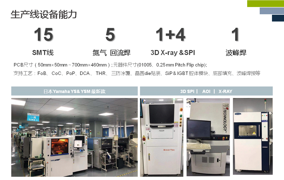 據三科創(chuàng)總經理陳元輝先生介紹:公司擁有先進高端的SMT進口設備生產線十五條,主要硬件品牌有:日本YAMAHA高精度高速度最新貼片機 YSM系列、GKG G9全自動新型印刷機、思泰克在線3d-SPI、美國Vitronics Soltec 回流焊設備及神洲最新款AOI檢測設備、法國VI在線AOI檢查機及 美國善思Xray檢測設備等眾多主流一線品牌設備,可貼裝01005、0201-LGA、BGA及QFN、SiP&POP工藝、晶圓貼裝能力,主要代工產品有,5G光模塊(SFP,SFP28,QSFP28,CFP,XFP等封裝25G-100G高速率,多方案)、無人機模塊、FPC軟硬板 及TWS穿戴產品等高端精密的PCBA產品。