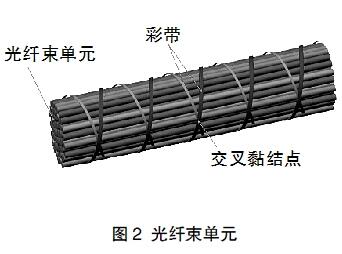光纖束單元——超大芯數(shù)可卷繞式帶狀光纜每個(gè)光纖束單元的芯數(shù)為80。由10個(gè)8芯的束狀光纖螺旋絞合(圖2),然后通過兩條不同顏色的彩帶交叉纏繞并于交叉點(diǎn)處進(jìn)行膠合,從而使得光纖數(shù)單元穩(wěn)固。該類型的黏結(jié)點(diǎn)易于剝離,便于光纜施工接續(xù)。