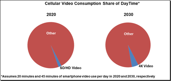 由于容量上升以及不需要增加更多站點(diǎn),每比特的成本收益提高了不少,也不難理解Massive MIMO對(duì)運(yùn)營(yíng)商的巨大吸引力。2019年,Massive MIMO技術(shù)占5G移動(dòng)基礎(chǔ)設(shè)施市場(chǎng)的70%以上。所以毫無(wú)疑問(wèn),Massive MIMO的前景仍然樂(lè)觀,這表明運(yùn)營(yíng)商將使用32T32R、64T64R,以及最終的128T128R天線(xiàn),盡可能從中頻段頻譜中擠壓出更多容量和價(jià)值。根據(jù)頻譜資產(chǎn)的不同,有效的Massive MIMO策略可以再產(chǎn)生5-15倍的增長(zhǎng)。無(wú)論如何,中高頻帶頻譜中的Massive MIMO不足以支撐未來(lái)巨大的流量消耗,也不能應(yīng)對(duì)任何顛覆性設(shè)備的引入。盡管視頻消耗占了2019年移動(dòng)數(shù)據(jù)流量的最大份額,但智能手機(jī)用戶(hù)現(xiàn)在平均每天僅花費(fèi)約20分鐘在蜂窩網(wǎng)絡(luò)上觀看視頻,基線(xiàn)預(yù)測(cè):到2030年,每天流媒體4K視頻的時(shí)間將超過(guò)45分鐘。非授權(quán)頻譜支持者傾向于將6GHz頻段的大部分頻譜分配給非授權(quán)應(yīng)用,這意味著他們預(yù)計(jì)移動(dòng)數(shù)據(jù)消耗增長(zhǎng)的放緩速度將遠(yuǎn)遠(yuǎn)快于普遍預(yù)期,或者毫米波技術(shù)可以在解決預(yù)期的短缺方面發(fā)揮重要作用。