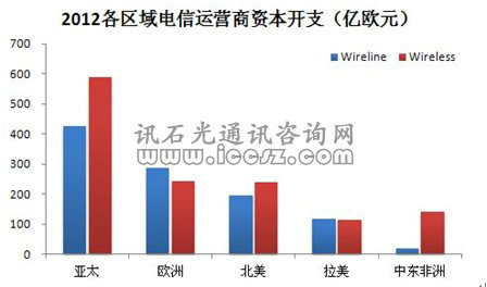 而新興市場在推動全球運營商資本開支增長。2012年來自金磚四國、中東和非洲、拉美的電信資本開支上升了近90億歐元,占全球凈增數(shù)的57%。亞太地區(qū)目前仍是最活躍的地區(qū),而其中中國成為該地區(qū)最大的資本開支國。