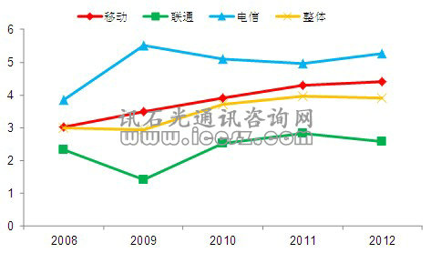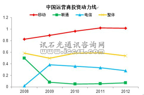 總結(jié):從圖三可看出,中國電信市場優(yōu)勢最明顯,而聯(lián)通在這方面表現(xiàn)則相對較差,但09年之后表現(xiàn)有所改善。如結(jié)合圖三和圖四對比分析可看出,電信市場最占優(yōu),但其投資動力卻沒有跟上。目前電信投資動力雖比聯(lián)通要好,但卻遠低于移動,反映其在利潤回傳或利潤率提高方面出了問題,即其公司內(nèi)部結(jié)構(gòu)布局不合理,不能很好的把市場優(yōu)勢能量轉(zhuǎn)化為利潤能量,因此中國電信應(yīng)進行一次改革,或內(nèi)在結(jié)構(gòu)調(diào)整升級。而此次LTE部署就是一個很好的調(diào)整機會!但機會往往與風險同行,中國電信視乎看到了這點,即國家希望電信與移動一起建立TD-LTE,但電信卻對LTE FDD情有獨鐘。如果電信與移動一起上TD-LTE,以目前電信的實力與移動展開正面交鋒,其結(jié)果可想而知,而且國際上主流的是LTE FDD。再看圖四,電信的投資動力不是很充足,如果TD-LTE和LTE FDD一起建設(shè),估計電信壓力很大,因此認為電信不會在TD-LTE與LTE FDD上均衡發(fā)力,而是有側(cè)重。從圖四看,聯(lián)通目前最迫切的是提高投資動力,而不是急于進一步投資,只有把投資動力提升,才有可能在下一個戰(zhàn)役(5G)進一步擴大果實。因此,預(yù)計中國聯(lián)通在LTE上不會像中國移動和電信那樣積極投資,而是順勢而為以盡可能少的資金掌握3G、LTE直至5G的演進,而后在5G到來時搶占先機,重燃3G戰(zhàn)火。這就要求聯(lián)通加強與華為、愛立信這些巨頭設(shè)備商合作,給設(shè)備商施壓讓其在盡可能短的時間內(nèi)提高技術(shù)進步,從而縮短從LTE進入5G的時間。