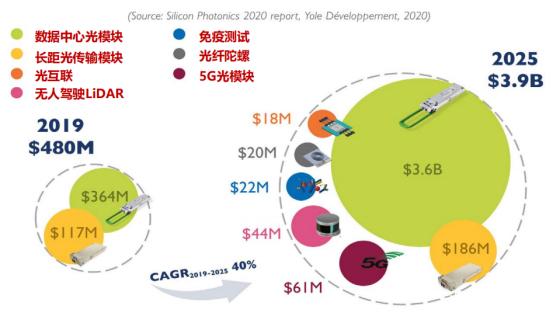 硅基光電子學(xué)市場應(yīng)用前景廣闊,預(yù)估2019年市場有4億多美金,2025年有40~50億美金,年增長率約40%。主要應(yīng)用領(lǐng)域?yàn)閿?shù)據(jù)中心光模塊、長距光傳輸模塊、光互連、5G光模塊、無人駕駛LiDAR、免疫測試、光纖陀螺等。