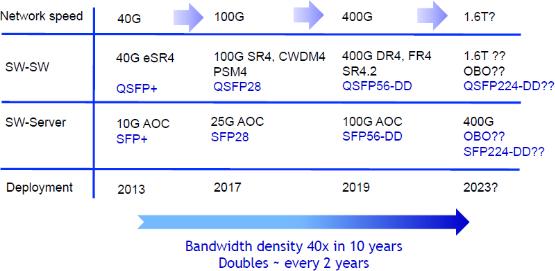 從阿里的roadmap可以看到帶寬從2013年的40G到2019年實(shí)現(xiàn)400G,平均每兩年翻一番,2023年預(yù)計達(dá)到1.6T,但新的標(biāo)準(zhǔn)還沒有制定下來,還有很多研究價值和空間。