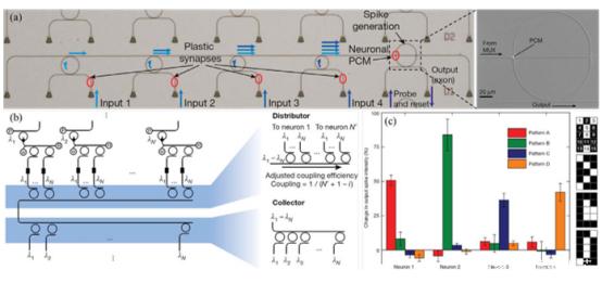 2019年,英國牛津大學(xué)基于氮化硅微環(huán)結(jié)構(gòu)和相變材料,利用波分復(fù)用結(jié)構(gòu)實(shí)現(xiàn)了全光類腦神經(jīng)網(wǎng)絡(luò),具備監(jiān)督學(xué)習(xí)和無監(jiān)督學(xué)習(xí)能力。通過對神經(jīng)網(wǎng)絡(luò)進(jìn)行訓(xùn)練,實(shí)現(xiàn)了對15個像素點(diǎn)圖片的識別。