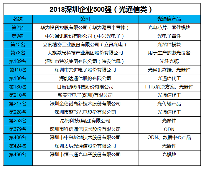 值得一提,在深圳500強(qiáng)企業(yè)名單中,也有16家從事光纖通信產(chǎn)品設(shè)計、研發(fā)、制造與銷售的企業(yè)入選2018深圳500強(qiáng)企業(yè),他們分別如下: