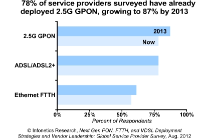 * 78%受訪的運營商已經(jīng)部署了2.5G GPON,這個比例到2013年會上升至87%。