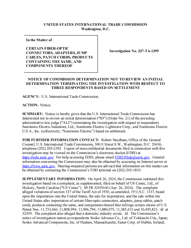 ICC訊 據(jù)中國(guó)貿(mào)易救濟(jì)信息網(wǎng),8月9日,美國(guó)國(guó)際貿(mào)易委員會(huì)(ITC)發(fā)布公告稱,對(duì)特定光纖連接器、適配器、跨接電纜、跳線以及下游產(chǎn)品及組件(Certain Fiber-Optic Connectors, Adapters, Jump Cables, Patch Cords, Products Containing the Same, and Components Thereof,調(diào)查編碼:337-TA-1399)作出337部分終裁:對(duì)本案行政法官于2024年7月15日作出的初裁(No.21)不予復(fù)審,即基于和解,終止對(duì)列名被告日本Sumitomo Electric Industries, Ltd. of Japan、美國(guó)Sumitomo Electric Lightwave Corp. of Raleigh, NC、美國(guó)Sumitomo Electric U.S.A., Inc. of Torrance, CA的調(diào)查。