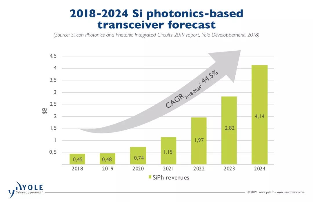 “硅光子未來(lái)將有最高的年復(fù)合增長(zhǎng)率,為44%”,Yole分析師Eric Mounier表示:“該市場(chǎng)將從2018年的4.55億美元,增長(zhǎng)到2024年的40億美元。”