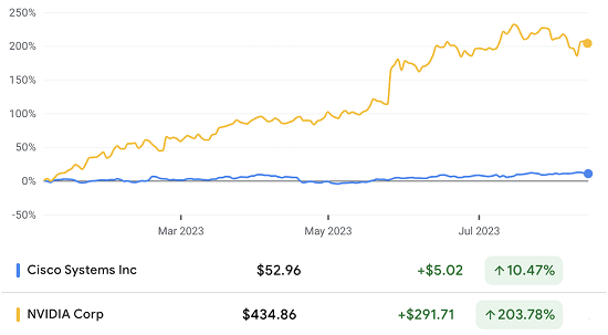 思科和英偉達(dá)今年的股價(jià)表現(xiàn)