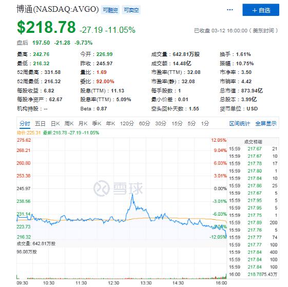 財(cái)報(bào)公布后,博通股價(jià)大跌近10%,據(jù)悉,當(dāng)日美股收盤跌超11%,股價(jià)創(chuàng)2019年以來新低。