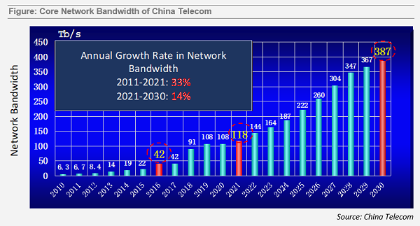 盡管預(yù)計(jì)本十年剩余時(shí)間的網(wǎng)絡(luò)帶寬增長率較低,但核心網(wǎng)絡(luò)基礎(chǔ)設(shè)施的升級仍將繼續(xù)。所有中國服務(wù)提供商計(jì)劃在2023年底或最遲2024年開始部署400G QPSK系統(tǒng)。