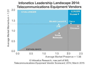 ICCSZ訊 近日,市場(chǎng)調(diào)研公司Infonetics發(fā)布其最新的關(guān)于2014年電信設(shè)備供應(yīng)商調(diào)查報(bào)告。該報(bào)告分析全球領(lǐng)先的六大電信設(shè)備供應(yīng)商——阿爾卡特朗訊、思科、愛(ài)立信、華為、諾基亞和中興——在基礎(chǔ)設(shè)施、軟件和硬件方面的發(fā)展情況。