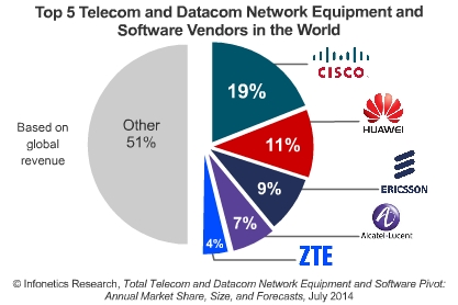 *基于全球收入,整體電信和數(shù)據(jù)通信網(wǎng)絡(luò)設(shè)備和軟件市場份額領(lǐng)導(dǎo)者的排名為:思科、華為、愛立信、阿爾卡特朗訊和中興 。