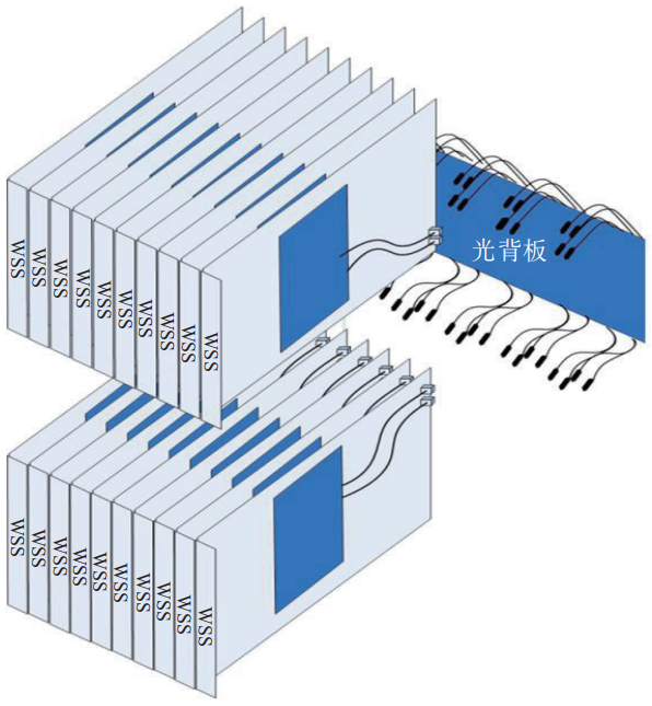 由于光存儲(chǔ)、光處理、波長轉(zhuǎn)換等關(guān)鍵技術(shù)還不夠成熟,現(xiàn)有光交叉技術(shù)主要是采用波長選擇交叉開關(guān)或空間光交叉開關(guān)的光線路交換技術(shù)。光交叉設(shè)備主要由光交叉連接矩陣、輸入接口、輸出接口、管理控制單元等模塊組成。光交叉已發(fā)展為集成式光交叉,如圖1所示,集成式光交叉以光背板技術(shù)為核心,分別采用硅基液晶、高密度光連接器、數(shù)字化光層等關(guān)鍵技術(shù),可大大減少單板堆疊,免除板間連纖,實(shí)現(xiàn)單板即插即用,提高系統(tǒng)的可靠性,構(gòu)建更高維度全光交叉互聯(lián)[4]。