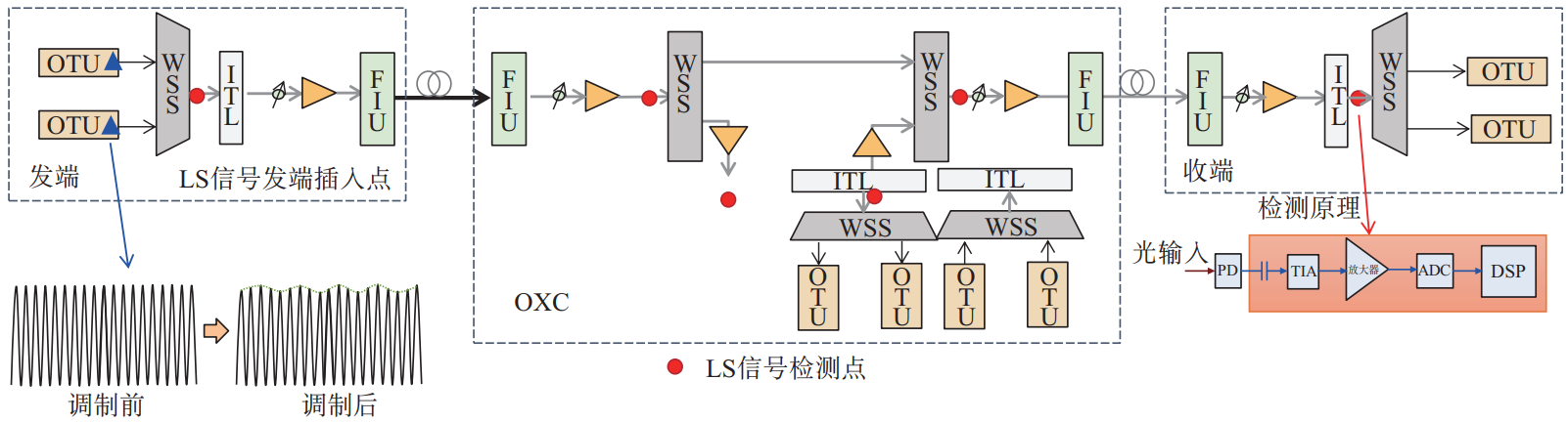 如圖3所示,在光電融合交叉設(shè)備的發(fā)送端,即每個(gè)OTU的輸出端,加載低頻調(diào)頂信號(hào),調(diào)頂信號(hào)頻率與信號(hào)波長一一對應(yīng),實(shí)現(xiàn)波長級(jí)調(diào)頂OAM。在光電混合全光網(wǎng)中各個(gè)節(jié)點(diǎn)設(shè)置檢測點(diǎn),實(shí)現(xiàn)調(diào)頂信號(hào)檢測,在光信號(hào)波長經(jīng)過的各個(gè)節(jié)點(diǎn)均可檢測開銷,從而識(shí)別信號(hào)波長的各種關(guān)鍵特征信息。