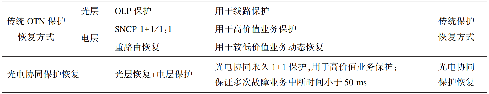 傳統(tǒng)的OTN網(wǎng)絡(luò)分別在光層提供了OLP保護(hù)和SNCP保護(hù),同時(shí)可以在電層進(jìn)行預(yù)置和動(dòng)態(tài)重路由恢復(fù)[8]。通過光層智能控制,在光電混合全光網(wǎng)中引入光層恢復(fù)機(jī)制,結(jié)合原有光層OLP保護(hù)、電層SNCP保護(hù)和電層恢復(fù),可實(shí)現(xiàn)更多光電協(xié)同保護(hù)恢復(fù)組合,提供更豐富的差異化保護(hù)恢復(fù)等級(jí)(見表1)。