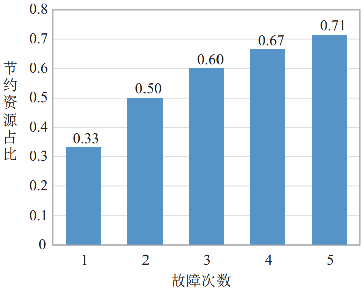 傳統(tǒng)的1+1保護(hù)在出現(xiàn)故障后,一方面需要恢復(fù)業(yè)務(wù),另一方面需要重新計(jì)算并占用端到端資源,在多次故障的情況下,占用的冗余資源成倍增長。在引入光層恢復(fù)后,當(dāng)工作路徑發(fā)生故障時(shí),首先通過電層保護(hù)實(shí)現(xiàn)快速倒換,之后在原工作路徑進(jìn)行光層恢復(fù)作為備用路徑,無需重復(fù)占用端到端資源。在多次故障情況下,通過光電協(xié)同實(shí)現(xiàn)永久1+1相對于傳統(tǒng)永久1+1保護(hù),節(jié)約資源占比如圖9所示。