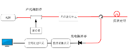 而基于φ-OTDR原理的分布式光纖振動(dòng)傳感技術(shù)就是利用后向瑞利散射光進(jìn)行振動(dòng)探測(cè),利用光時(shí)域反射技術(shù)來進(jìn)行振動(dòng)事件定位,其基本原理為:窄線寬光源發(fā)射連續(xù)光,經(jīng)過聲光調(diào)制器調(diào)制成脈沖光,脈沖光經(jīng)過光纖放大模塊進(jìn)行放大后進(jìn)入傳感探測(cè)光纜中,返回的瑞利散射信號(hào)光經(jīng)環(huán)形器進(jìn)入光電探測(cè)模塊,實(shí)現(xiàn)光信號(hào)到電信號(hào)的轉(zhuǎn)換,再由數(shù)據(jù)采集單元和信號(hào)處理單元進(jìn)行數(shù)據(jù)采集與處理,最終輸出振動(dòng)信號(hào)。