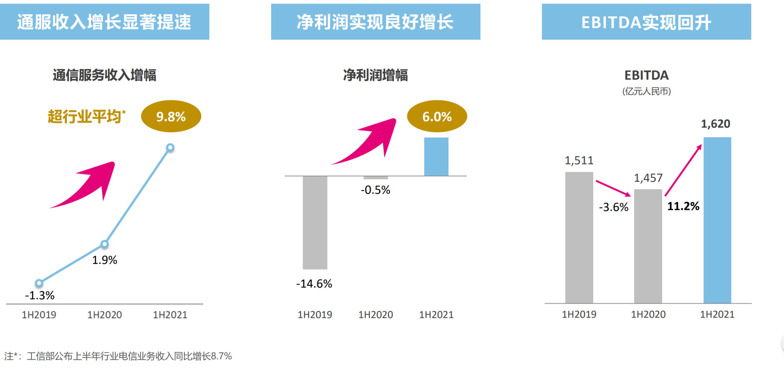 ICC訊 (編輯:Nicole)    中國(guó)移動(dòng)發(fā)布2021年中期業(yè)績(jī)公告稱:報(bào)告期內(nèi),營(yíng)運(yùn)收入為人民幣4,436億 元, 同比增長(zhǎng)13.8%; 其 中, 通信服務(wù)收入為人民幣3,932億 元,同比增長(zhǎng)9.8% ; EBITDA1為人民幣1,620億 元,同比增長(zhǎng)11.2%;股東應(yīng)佔(zhàn)利潤(rùn)為人民幣591億 元,同比增長(zhǎng)6.0% ; 移動(dòng)電話客戶總數(shù)為9.46億戶,有綫寬帶客戶總數(shù)為2.26億戶,宣佈派發(fā)中期股息每股1.63港元,同比增長(zhǎng)6.5%。