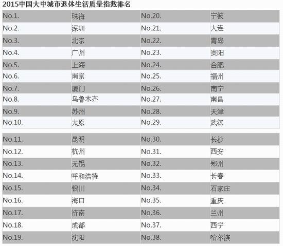 2015中國大中城市退休生活質(zhì)量指數(shù)排名