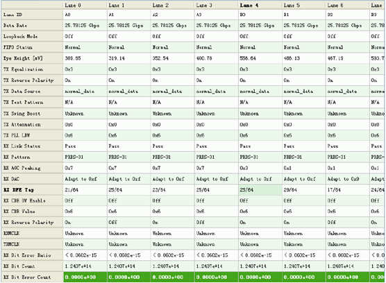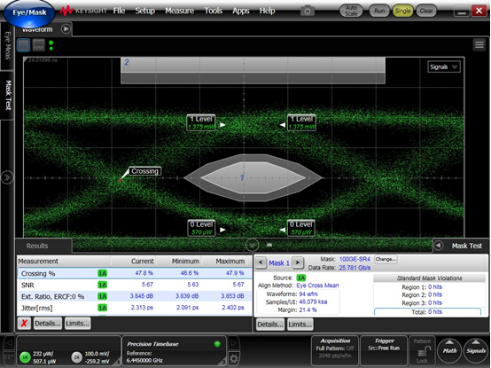 第一代100GE QSFP28 SR4的設計性能符合IEEE 802.3bm 100GBASE SR4和InfiniBand EDR協(xié)議標準。發(fā)射光功率范圍在+-0.5dbm.接收OMA參數(shù)略低于協(xié)議標準,但是完全滿足OM3 光纖75米傳輸和OM4光纖100米傳輸應用.實際測試環(huán)境依據(jù)更嚴格的誤碼率測試標準(<-15次方),傳輸OM4光纖沒有發(fā)現(xiàn)任何誤碼.該模塊采用易飛揚自主研制的透鏡與光引擎,集成了四路25Gbps的數(shù)據(jù)通道,典型功耗3.2W.支持除TX功率外的其它項目數(shù)字診斷功能.該模塊獲得了非常優(yōu)秀的光眼圖和電眼圖性能。