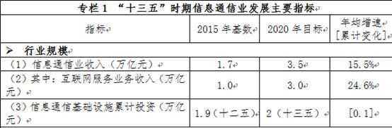 《信息通信行業(yè)發(fā)展規(guī)劃(2016-2020年)》提出,到2020年信息通信業(yè)收入將達(dá)到3.5萬億元較2015年的1.7萬億元增長15.5%,其中互聯(lián)網(wǎng)服務(wù)業(yè)務(wù)收入將達(dá)3萬億元較2015年的1萬億元增長24.6%。