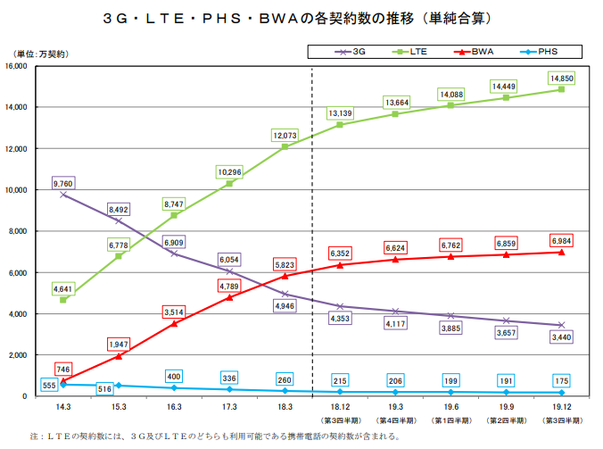 移動(dòng)寬帶方面,截至2019年底,日本LTE用戶達(dá)到14850萬,相比上年同期的13139萬新增1711萬。BWA(Broadband Wireless Access,寬帶無線接入)用戶達(dá)到6984萬,年增632萬。3G用戶下滑至3440萬,相比上年同期減少913萬。