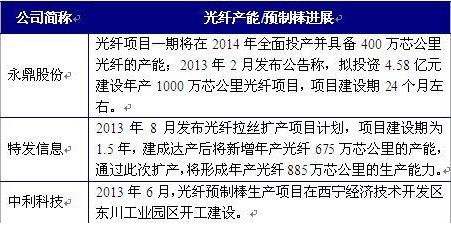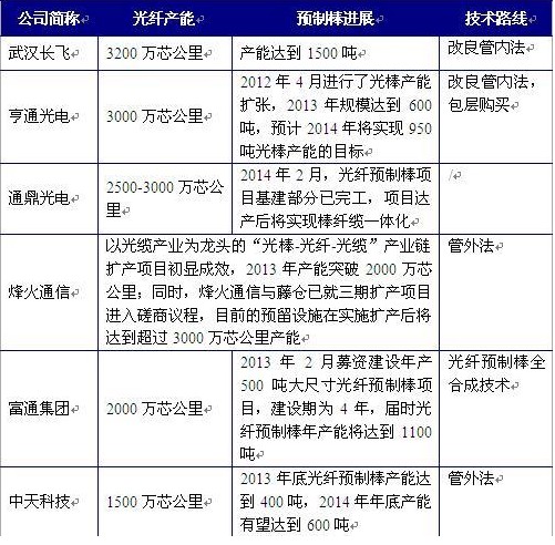 前瞻網(wǎng)光纖光纜行業(yè)報(bào)告數(shù)據(jù)顯示,2013年,長飛的光纖產(chǎn)能達(dá)到3200萬芯公里,光纖預(yù)制棒產(chǎn)能達(dá)到1500噸;亨通光電的光纖產(chǎn)能達(dá)到3000萬芯公里,光棒產(chǎn)能規(guī)模達(dá)到600噸,2014年將實(shí)現(xiàn)950噸光棒產(chǎn)能的目標(biāo);通鼎光電的光纖產(chǎn)能達(dá)到2500-3000萬芯公里;烽火通信的“光棒-光纖-光纜”產(chǎn)業(yè)鏈擴(kuò)產(chǎn)項(xiàng)目初顯成效,產(chǎn)能突破2000萬芯公里;富通集團(tuán)的光纖產(chǎn)能達(dá)到2000萬芯公里,2017年左右光纖預(yù)制棒年產(chǎn)能將達(dá)到1100噸;中天科技的光纖產(chǎn)能達(dá)到1500萬芯公里,光纖預(yù)制棒產(chǎn)能達(dá)到400噸。