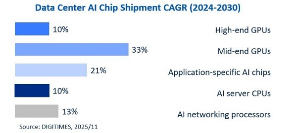 ICC訊——根據(jù)DIGITIMES Asia發(fā)布的最新報(bào)告,全球數(shù)據(jù)中心AI芯片出貨量預(yù)計(jì)將從2024年的3050萬(wàn)片增長(zhǎng)至2030年的5340萬(wàn)片。此類(lèi)數(shù)據(jù)中心AI芯片包括高端和中端GPU、專(zhuān)用AI芯片(如Google的TPU)、AI服務(wù)器CPU,以及網(wǎng)絡(luò)/互聯(lián)相關(guān)芯片(例如交換機(jī)ASIC/機(jī)架級(jí)互聯(lián)芯片/DPU和NIC)。