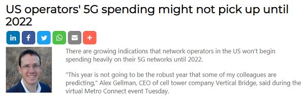 鐵塔公司Vertical Bridge首席執(zhí)行官Alex Gellman在本周二的虛擬活動(dòng)“Metro Connect”上表示:“我的一些同事預(yù)測(cè),今年不會(huì)是強(qiáng)勁的一年?!?